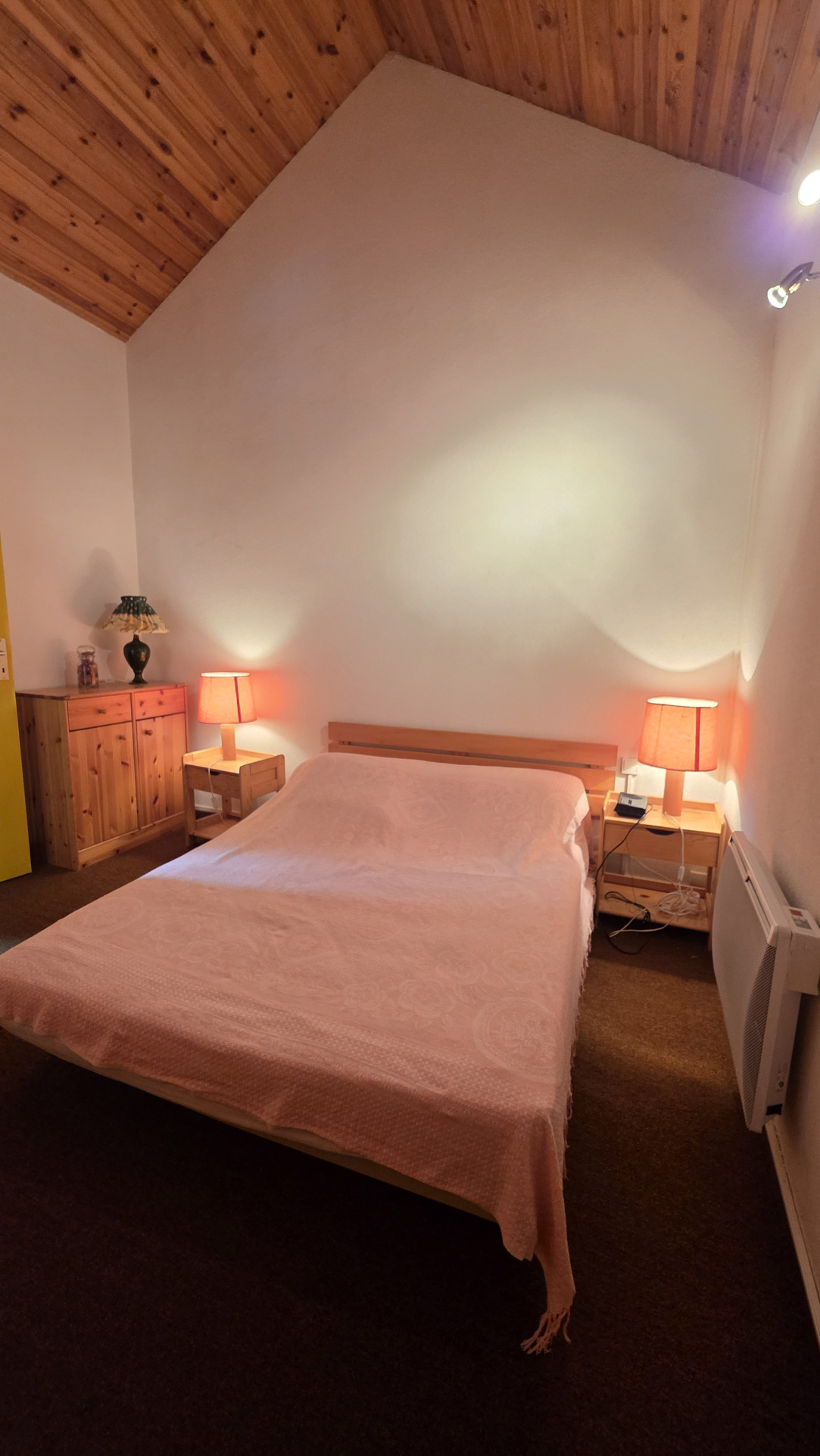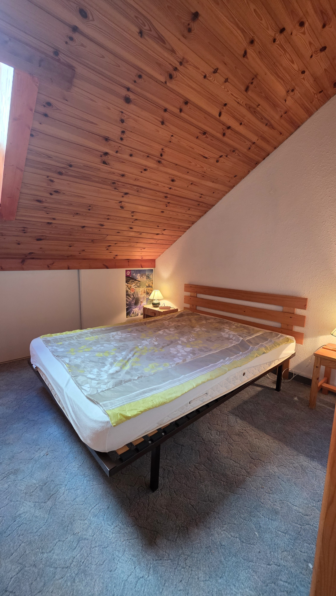 L’étage dévoile une chambre intime avec rangements et une mezzanine pleine de douceur, idéale pour les nuits paisibles après une journée d’aventure.